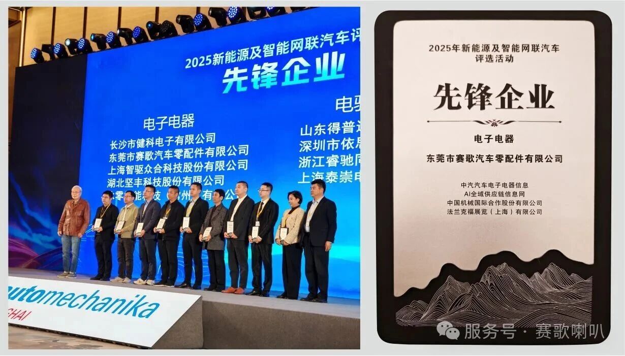 在展会同期举办的新能源及智能网联汽车评选活动中,赛歌凭借在技术创新、产品品质与行业贡献等方面的突出表现,从众多参赛企业中脱颖而出,成功斩获“先锋企业”称号。这一荣誉不仅是行业对赛歌在新能源及智能网联领域深耕成果的高度认可,更是对赛歌持续创新、引领行业发展的鼓励与肯定。多年来,赛歌始终紧跟汽车产业变革趋势,聚焦新能源与智能网联技术研发,不断突破技术瓶颈,推出了一系列符合市场需求的高品质产品,为推动汽车产业绿色化、智能化发展贡献了重要力量。
